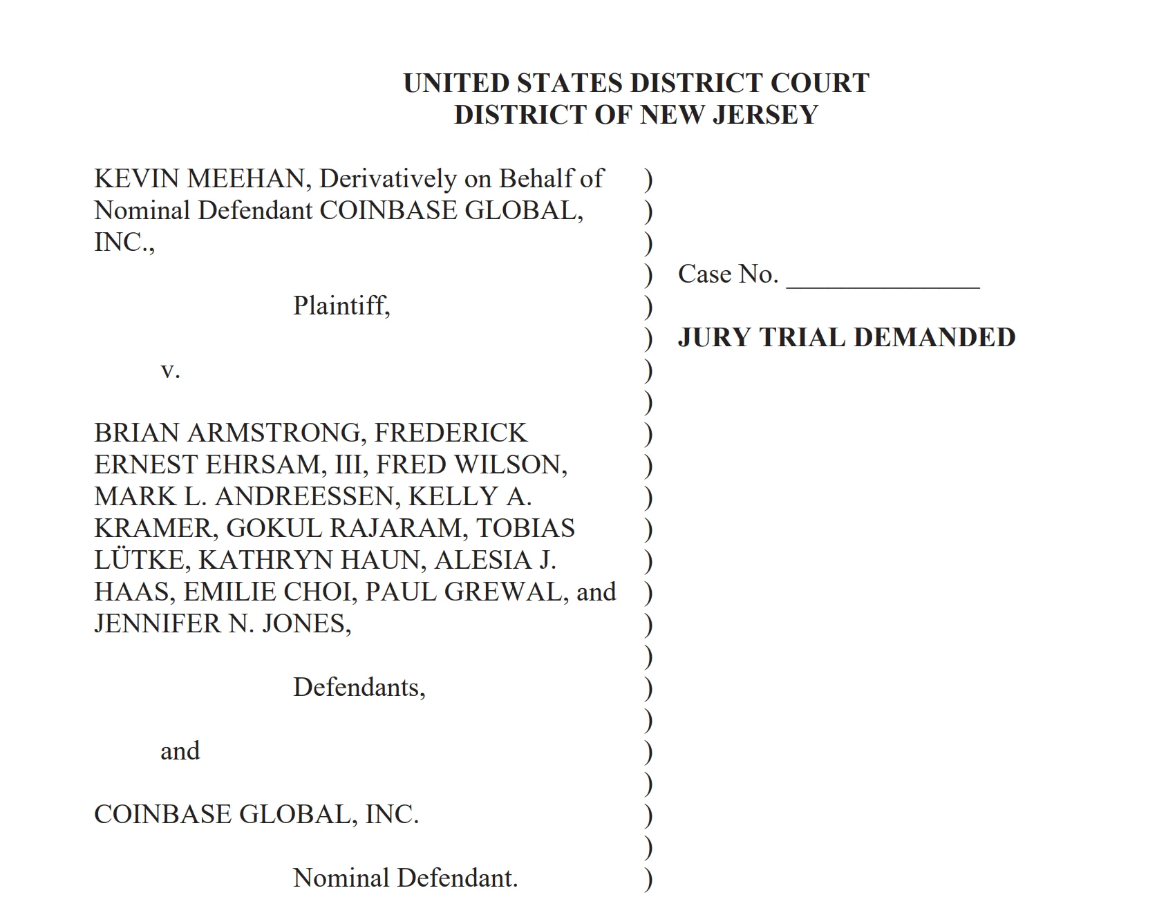 The complaint was filed Tuesday in the US District Court for the District of New Jersey and was brought by shareholder Kevin Meehan on behalf of Coinbase Global. It cites CEO Brian Armstrong, co-founder Fred Ehrsam, and several current and former directors and senior executives, including chief legal officer Paul Grewal and chief financial officer Alesia Haas.