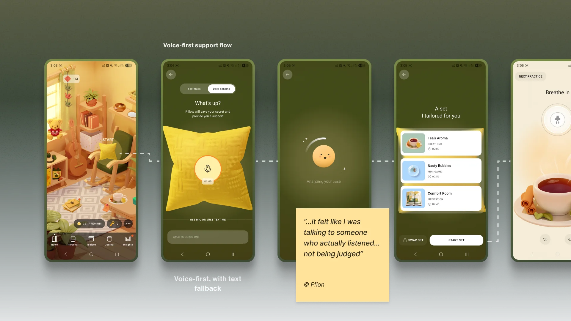 In both Teeni and Bear Room, voice was integrated as a primary path for flows related to fatigue, emotional overwhelm, and acute stress — always alongside a text input alternative. Simply putting feelings into words (affect labelling) has been shown to reduce emotional intensity for some users, and spoken input also provides a richer context for tailoring support.