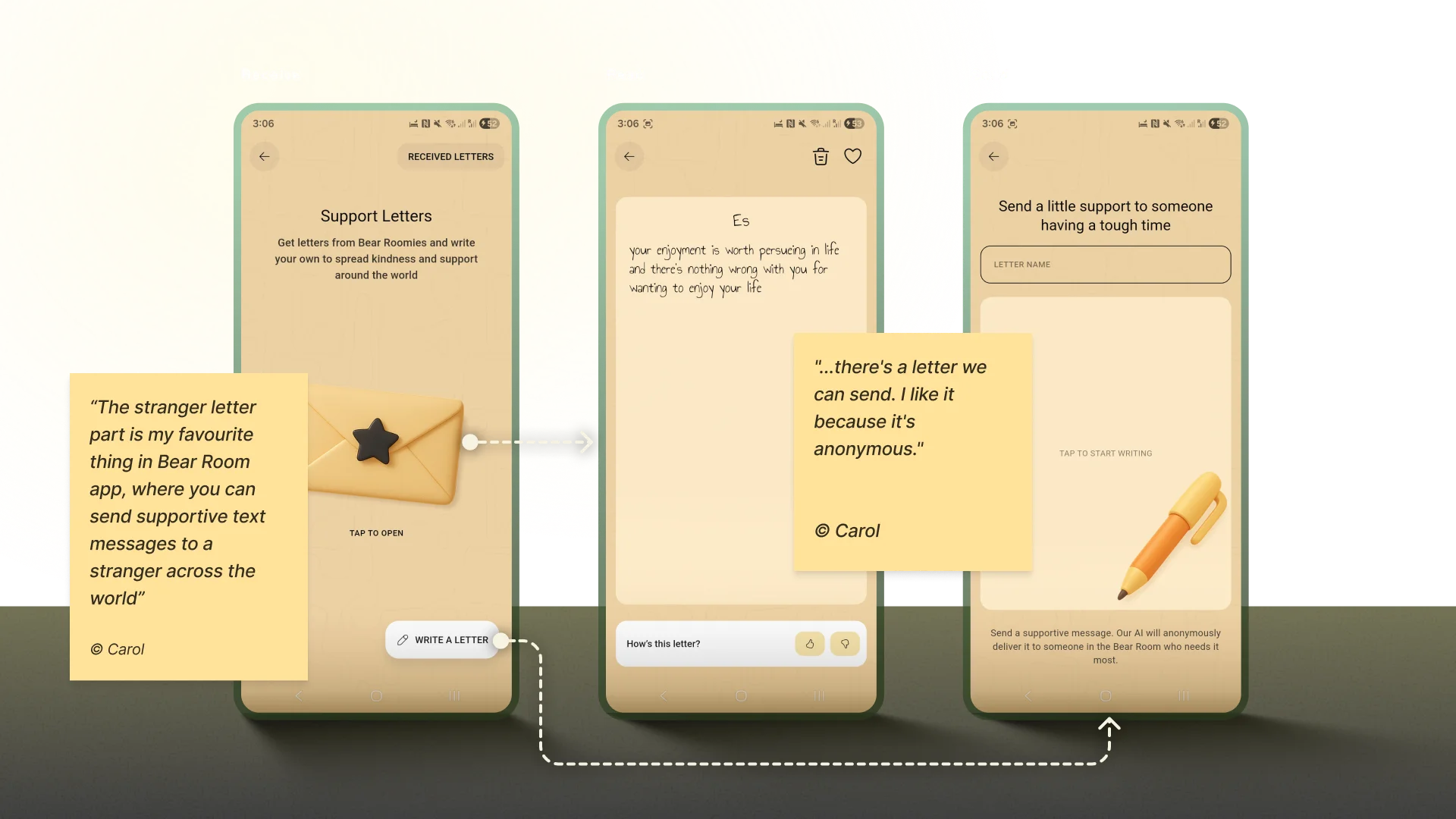 Within Bear Room, users can write and receive supportive letters anonymously to other users around the world. This tool leverages AI-powered anonymity to create a safe space for radical vulnerability. It provides a real human connection while completely protecting user privacy, directly addressing the trust deficit. It shows users they are not alone in their struggles, a powerful retention driver.