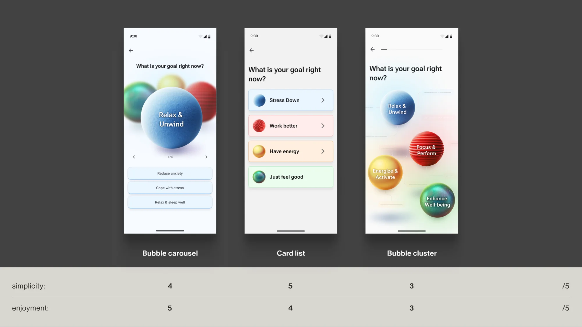 In an informal field test with young professionals (the target audience) in a co-working space, participants tried three interactive prototypes and rated each on simplicity and enjoyment. The standard card layout scored higher on simplicity, but the bubble carousel scored better on engagement and positive affect — and became the preferred option for the first iteration. Given that the simplicity trade-off was minimal (4/5 vs. 5/5) and limited to the first few seconds of use, I prioritised the concept that made the experience feel more emotionally rewarding.