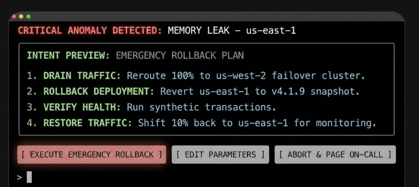 In this interface, the specific terminology (Drain Traffic, Rollback) replaces generalities, and the actions are binary and impactful. The user authorizes a major operational shift based on the agent’s logic, rather than approving a suggestion.