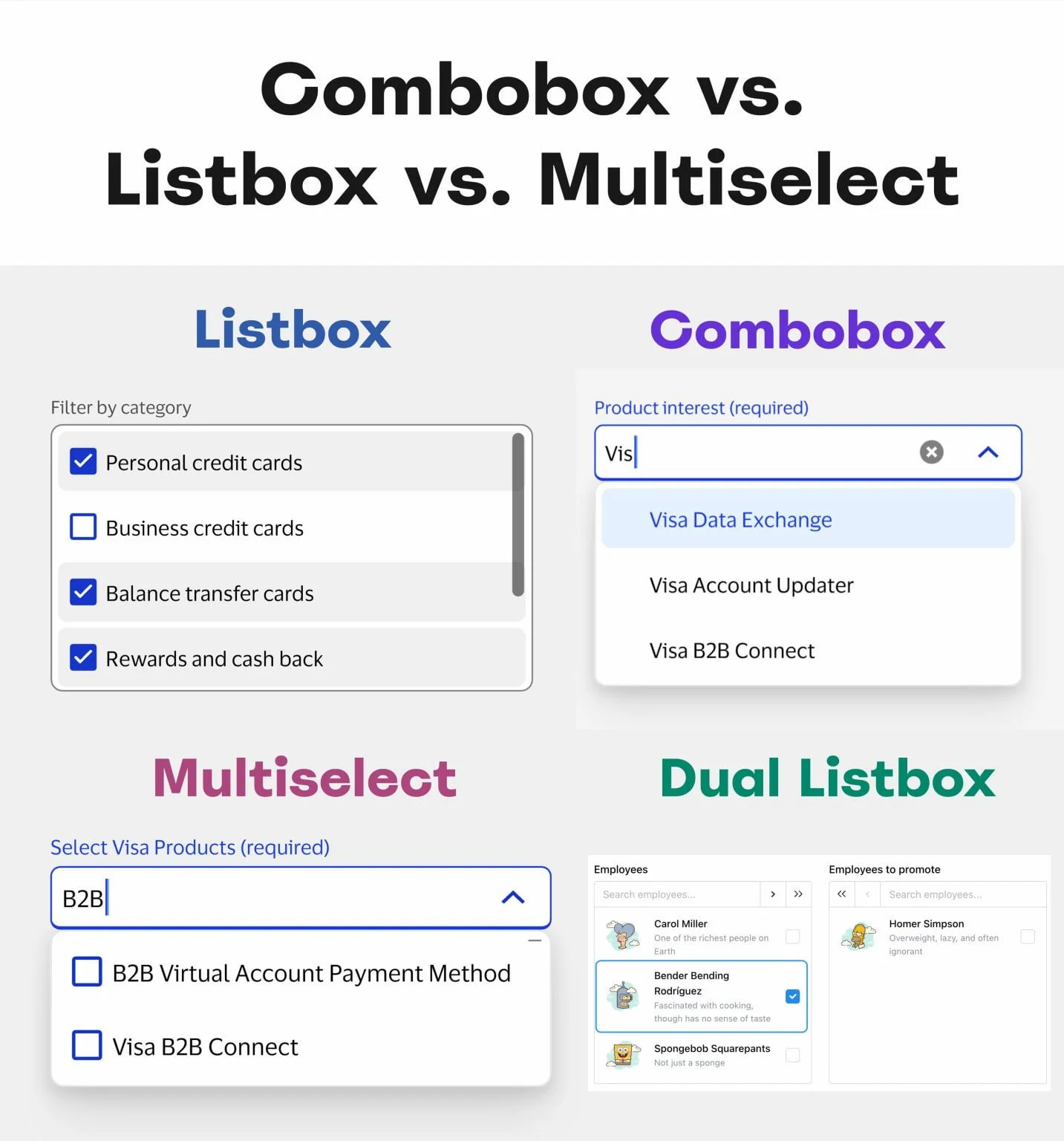 So what’s the difference between combobox, multiselect, listbox, and dropdown? While all these UI components might appear similar, they serve different purposes. The choice often comes down to the number of available options and their visibility.