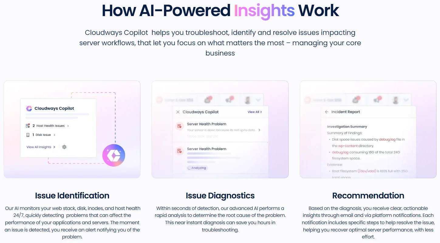 A New Approach: From Diagnosis To Automatic ResolutionThis is where a shift towards intelligent automation changes the game. Tools like Cloudways Copilot, which became generally available earlier this year, are built specifically to simplify this workflow. The goal is straightforward: combine AI-driven diagnostics with automated fixes to predict and resolve performance issues before they affect your users.