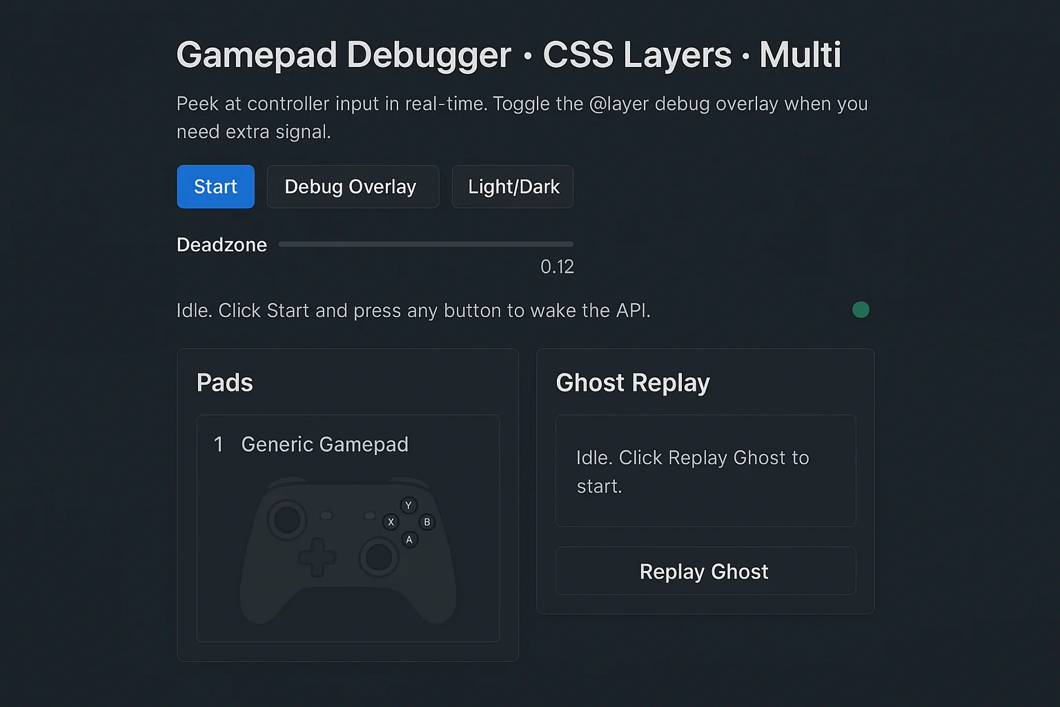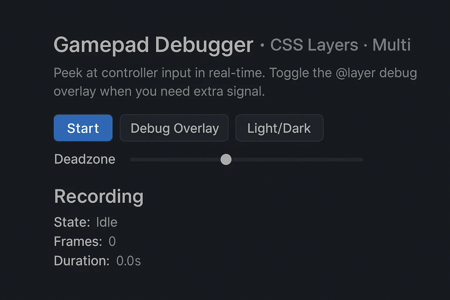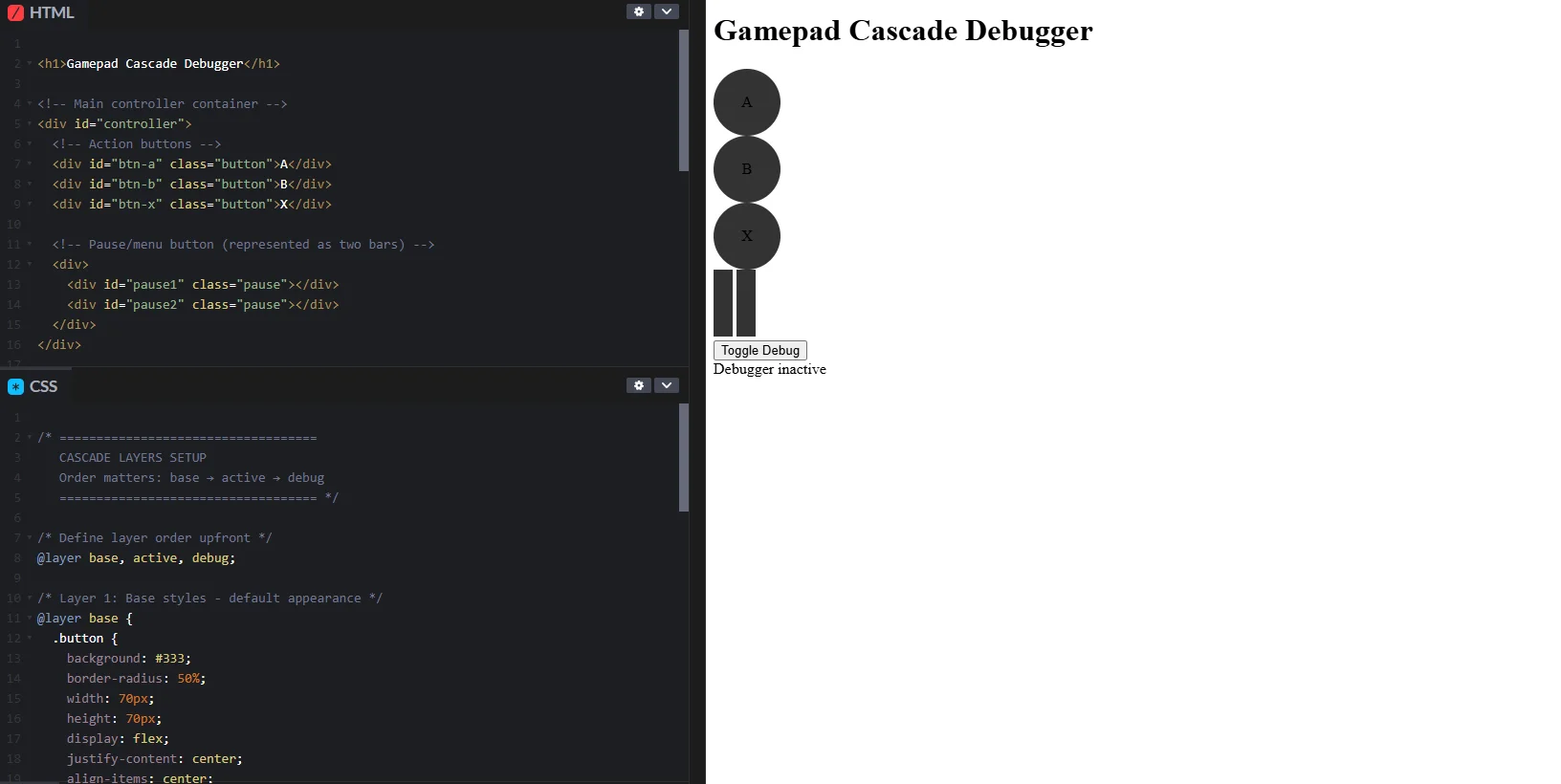 That bugged me enough to build a little tool: Gamepad Cascade Debugger. Instead of staring at console output, you get a live, interactive view of the controller. Press something and it reacts on the screen. And with CSS Cascade Layers, the styles stay organized, so it’s cleaner to debug.