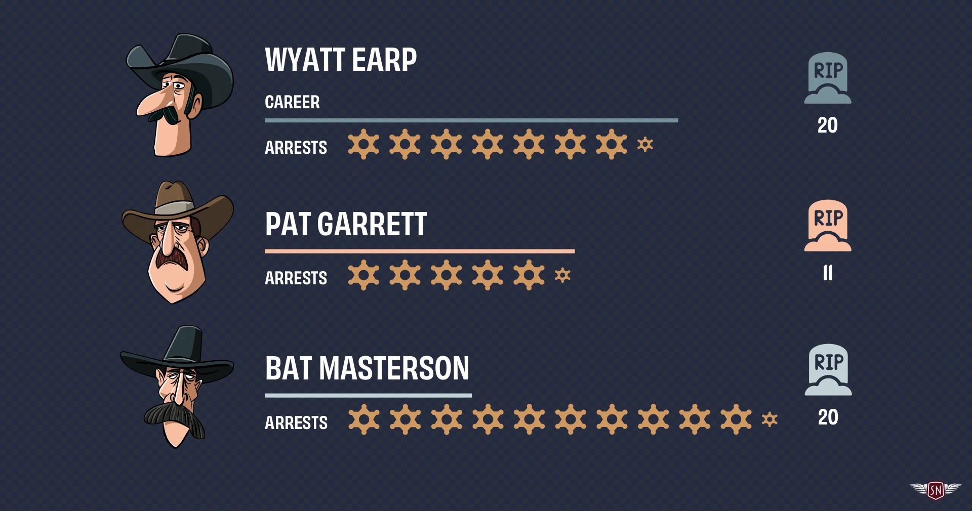 We can use <symbol> and <use> in plenty more practical ways. They’re also helpful for creating lightweight data visualisations, so imagine an infographic about three famous Wild West sheriffs: Wyatt Earp, Pat Garrett, and Bat Masterson.