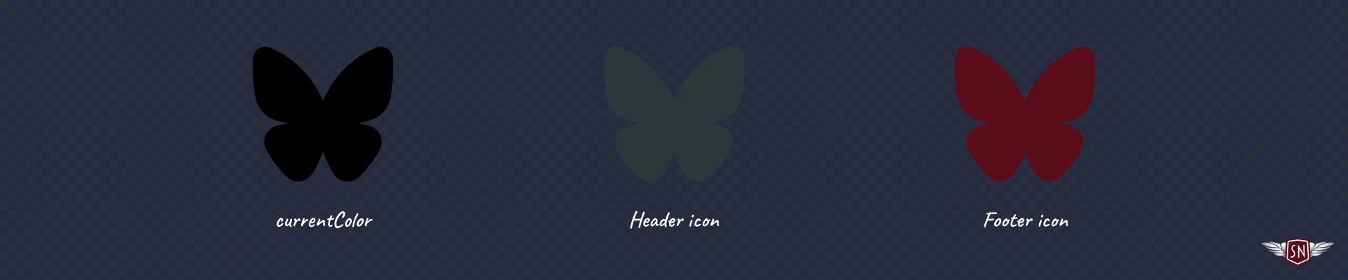 Then, whenever I need to vary how that icon looks — for example, in a <header> and <footer> — I can pass new fill colour values to each instance: