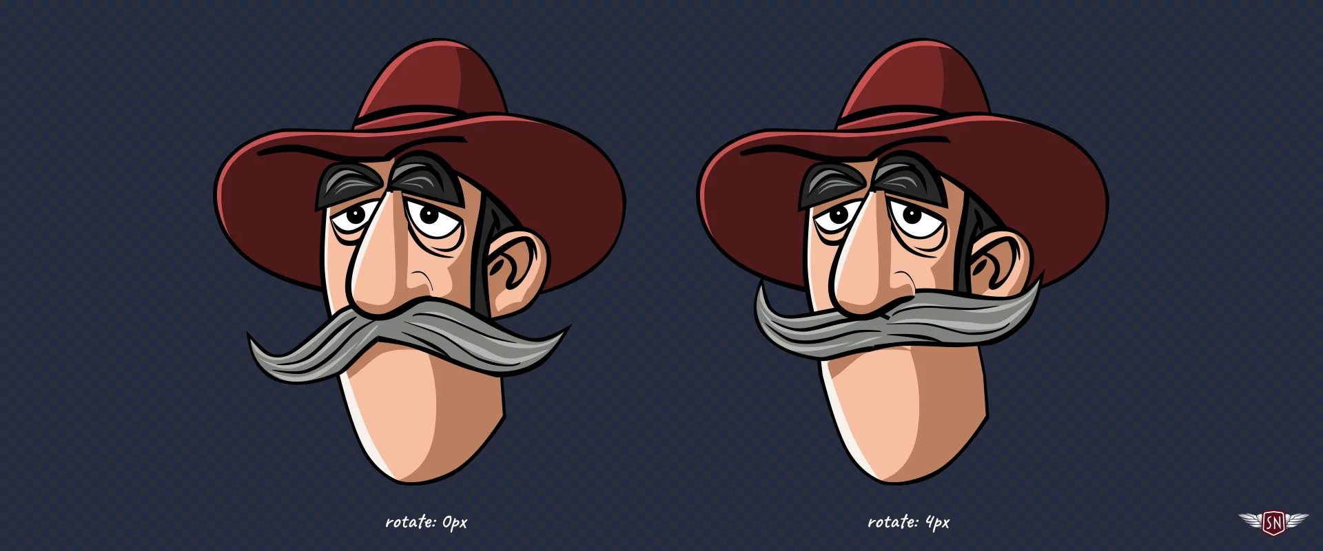 …before finally making the character’s whiskers jiggle via an inline style with a CSS Custom Property which describes how his moustache transforms: