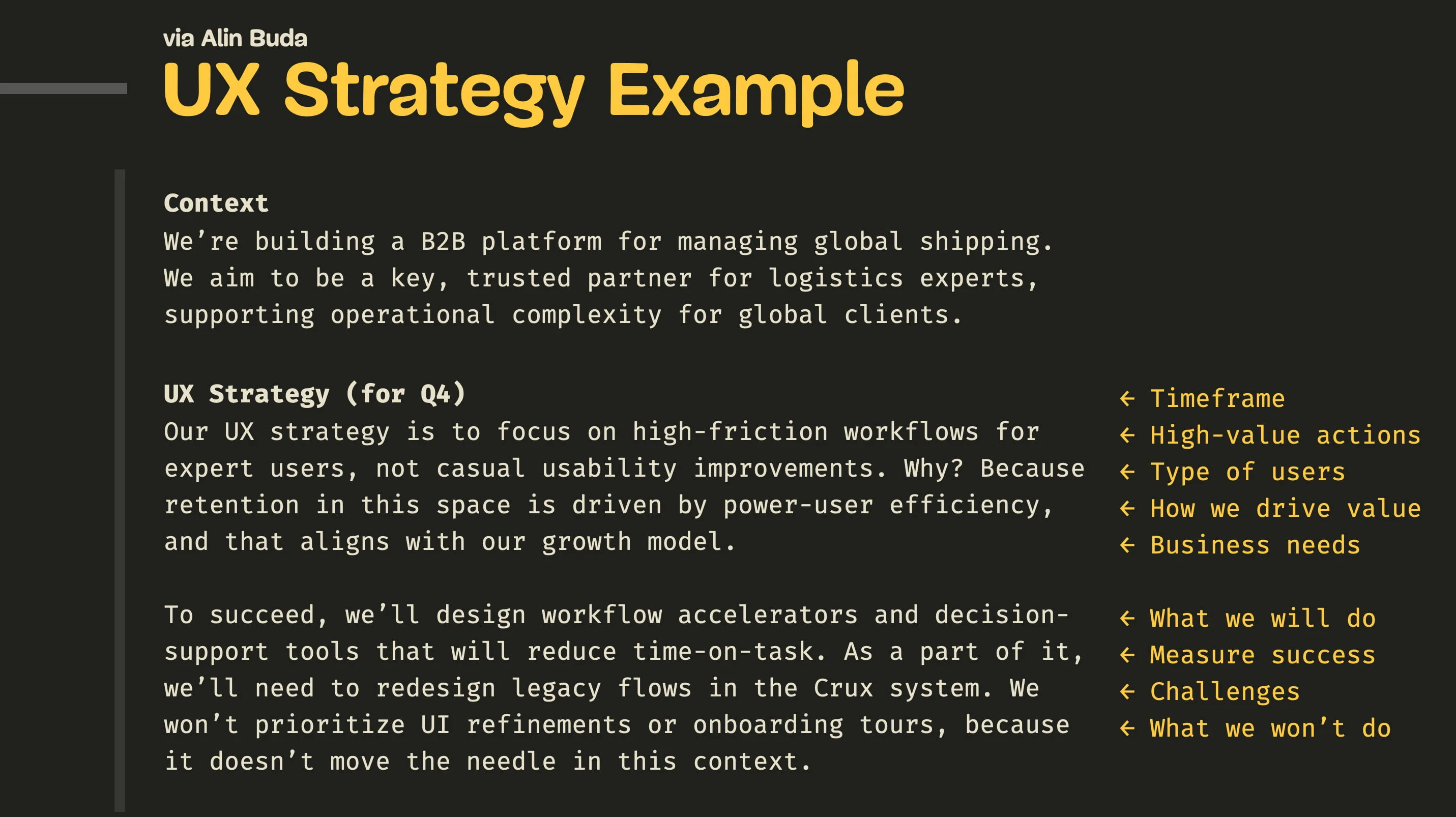 UX strategy doesn’t have to be a big 40-page long PDF report or a Keynote presentation. A while back, Alin Buda kindly left a comment on one of my LinkedIn posts, giving a great example of what a concise UX strategy could look like: